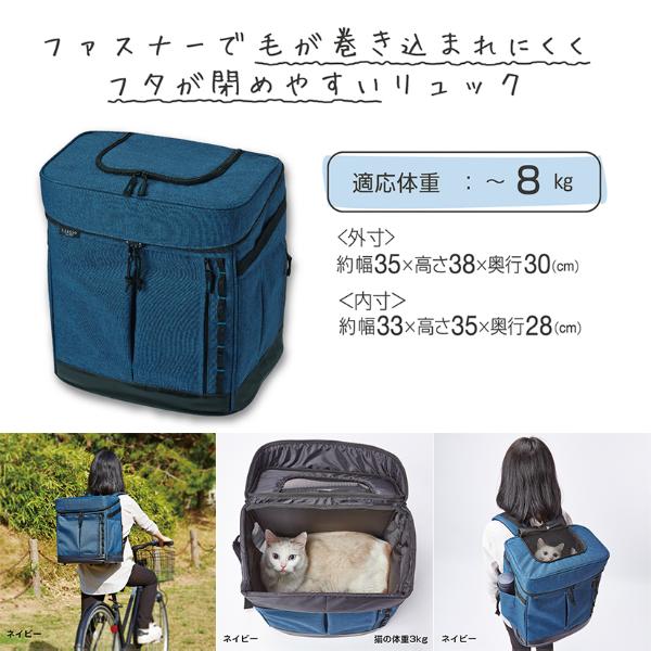 ファスナーで毛が巻き込まれにくく、フタが閉めやすいリュック。特許出願中の特殊構造で、フタが内側に落ちずに固定されるので開閉がスムーズ。また、底が傾きにくい水平構造と便利な13の機能で猫とのお出かけを快適に。スタイリッシュなデザインで男女兼用で使用できる。