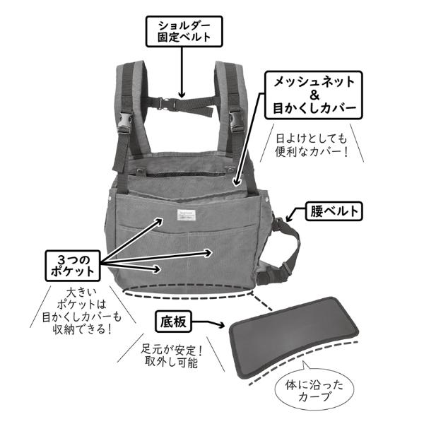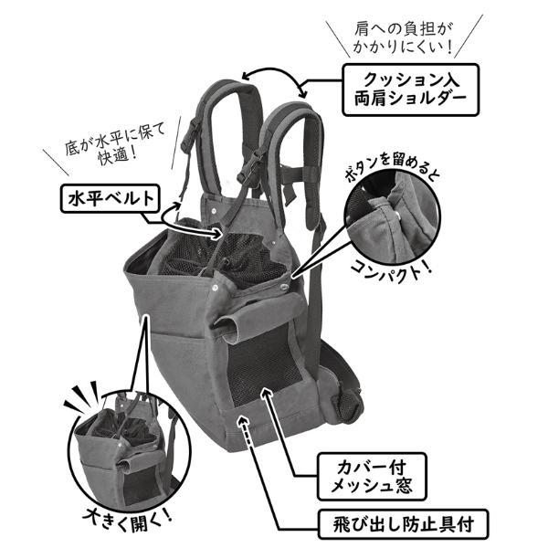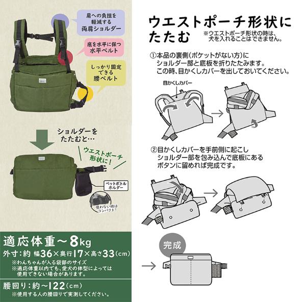 抱っこ感覚で使えるキャリーバッグ。底を水平に保つ水平ベルトでお出かけ中もわんちゃん快適。両肩ショルダー仕様で肩への負担がかかりにくく、腰ベルトでしっかり固定できる。キャリーバッグとして使用しない時はウェストポーチ形状で、お散歩中も両手が使えて便利。