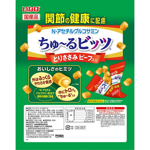 - 鶏肉(ささみ)、鶏脂、米粉、かつお節、ビーフエキス、牛肉、ガラクトオリゴ糖、卵白粉末、酵母エキス、N-アセチルグルコサミン、増粘安定剤(増粘多糖類、加工でん粉)、ビタミンE、紅麹色素、緑茶エキス
