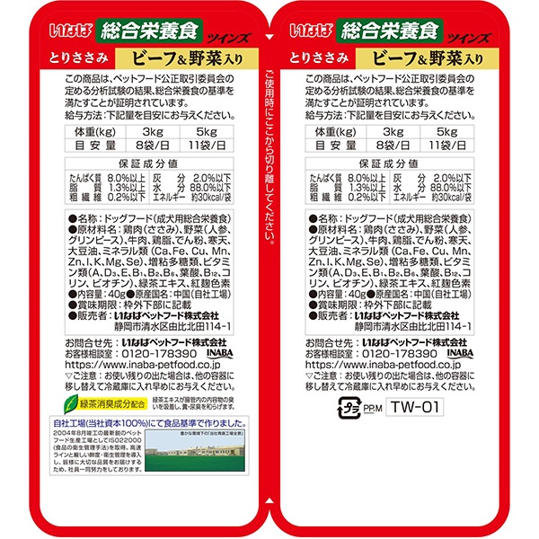 - 鶏肉(ささみ)、野菜(人参、グリンピース)、牛肉、鶏脂、でん粉、寒天、大豆油、ミネラル類(Ca、Fe、Cu、Mn、、Zn、I、K、Mg、Se)、増粘多糖類、ビタミン類(A、D3、E、B1、B2、B6、葉酸、B12、コリン、ビオチン)、緑茶エキス、紅麹色素