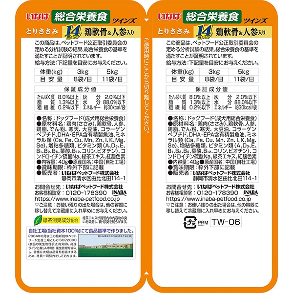 - 鶏肉(ささみ)、鶏軟骨、人参、鶏脂、でん粉、寒天、大豆油、コラーゲンペプチド、DHA・EPA含有精製魚油、ミネラル類(Ca、Fe、Cu、Mn、Zn、I、K、Mg、Se)、増粘多糖類、ビタミン類(A、D3、E、B1、B2、B6、葉酸、B12、コリン、ビオチン)、コンドロイチン硫酸Na、緑茶エキス、紅麹色素