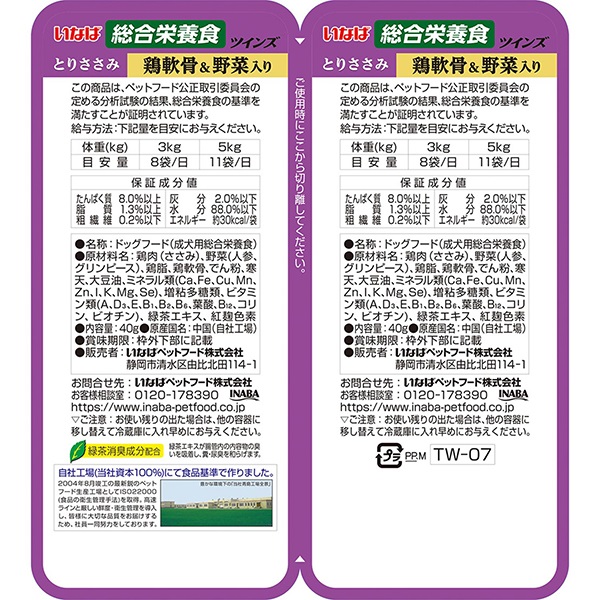 - 鶏肉(ささみ)、野菜(人参、グリンピース)、鶏脂、鶏軟骨、でん粉、寒天、大豆油、ミネラル類(Ca、Fe、Cu、Mn、Zn、I、K、Mg、Se)、増粘多糖類、ビタミン類(A、D3、E、B1、B2、B6、葉酸、B12、コリン、ビオチン)、緑茶エキス、紅麹色素