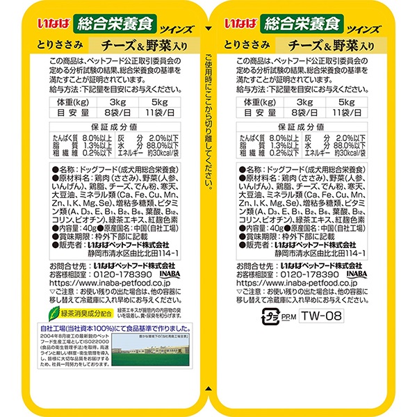 - 鶏肉(ささみ)、野菜(人参、いんげん)、鶏脂、チーズ、でん粉、寒天、大豆油、ミネラル類(Ca、Fe、Cu、Mn、Zn、I、K、Mg、Se)、増粘多糖類、ビタミン類(A、D3、E、B1、B2、B6、葉酸、B12、コリン、ビオチン)、緑茶エキス、紅麹色素