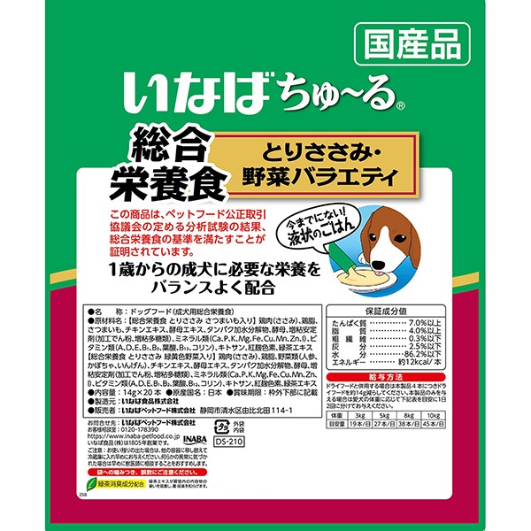 - 【とりささみ 緑黄色野菜入り】鶏肉(ささみ)、鶏脂、野菜類(人参、かぼちゃ、いんげん)、チキンエキス、酵母エキス、タンパク加水分解物、酵母、増粘安定剤(加工でん粉、増粘多糖類)、ミネラル類(Ca、P、K、Mg、Fe、Cu、Mn、Zn、I)、ビタミン類(A、D、E、B1、B2、葉酸、B12、コリン)、キトサン、紅麹色素、緑茶エキス【とりささみ さつまいも入り】鶏肉(ささみ)、鶏脂、さつまいも、チキンエキス、酵母エキス、タンパク加水分解物、酵母、増粘安定剤(加工でん粉、増粘多糖類)、ミネラル類(Ca、P、K、Mg、Fe、Cu、Mn、Zn、I、)、ビタミン類(A、D、E、B1、B2、葉酸、B12、コリン)、キトサン、紅麹色素、緑茶エキス
