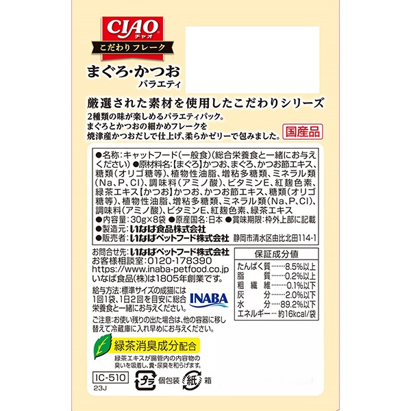 - 【まぐろ】かつお、まぐろ、かつお節エキス、糖類(オリゴ糖等)、植物性油脂、増粘多糖類、ミネラル類(Na、P、Cl)、調味料(アミノ酸)、ビタミンE、紅麹色素、緑茶エキス【かつお】かつお、かつお節エキス、糖類(オリゴ糖等)、植物性油脂、増粘多糖類、ミネラル類(Na、P、Cl)、調味料(アミノ酸)、ビタミンE、紅麹色素、緑茶エキス