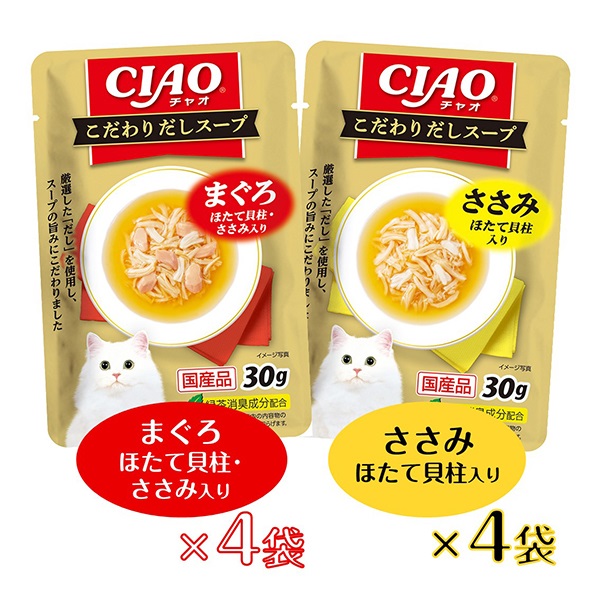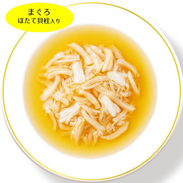 まぐろやかつお、ささみの細かめフレークにまぐろやかつお、ささみのフレークに猫ちゃんの喜ぶ素材を加え、とろりとしたスープで仕上げました。