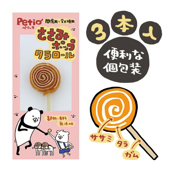 ささみとタラの2つの味が楽しめる!キャンディーみたいなかわいいポップスティック!ささみとタラとガムでできているから全部食べられる!