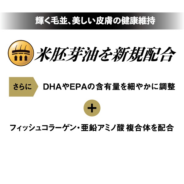 - 穀類(米、米粉、米ぬか)、魚介類(フィッシュミール、サーモンミール、フィッシュエキス、フィッシュコラーゲン)、油脂類(動物性油脂、ライスファットカルシウム、フィッシュオイル:DHA・EPA源、米胚芽油)、糖類(フラクトオリゴ糖)、軟骨抽出物:コンドロイチン源、共棲発酵エキス(乳酸菌、納豆菌、酵母菌)、シャンピニオンエキス、グルコサミン、セレン酵母、ビタミン類(A、E、K3、B1、B2、パントテン酸、ナイアシン、B6、葉酸、ビオチン、B12、C、コリン)、ミネラル類(カルシウム、リン、カリウム、塩素、鉄、コバルト、銅、マンガン、亜鉛アミノ酸複合体、亜鉛、ヨウ素)、アミノ酸類(メチオニン、トリプトファン、タウリン)、酸化防止剤(ガンマーオリザノール、ローズマリー抽出物、ミックストコフェロール)