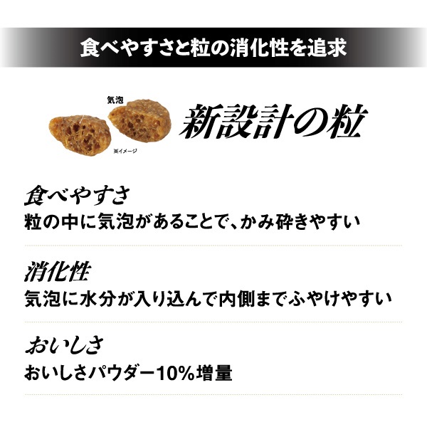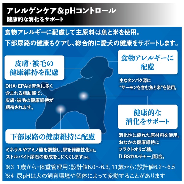 食物アレルギーに配慮し、主なたんぱく源に魚と米を使用。下部尿路の健康維持に、尿を弱酸性化(pH6.2~6.5)。免疫の健康維持に「LBSカルチャー」配合。消化性の良い原材料で健康的な消化をサポート。美しい毛並と皮膚の維持に米胚芽油・亜鉛・フィッシュコラーゲンを配合、DHA+EPA含有。穏やかな老齢期の健康維持をサポート。