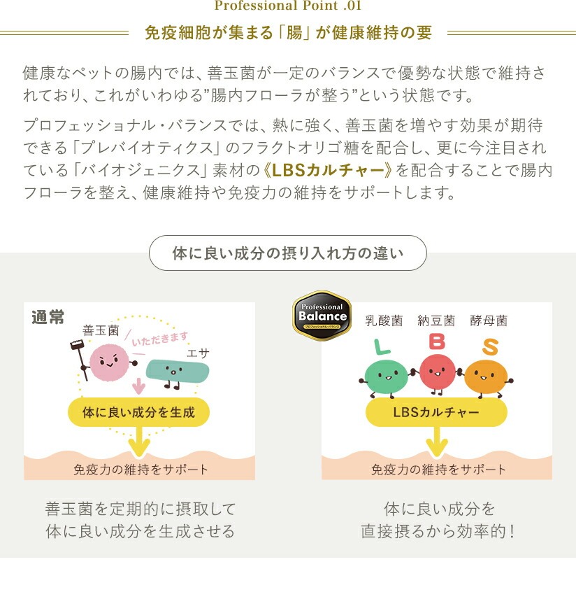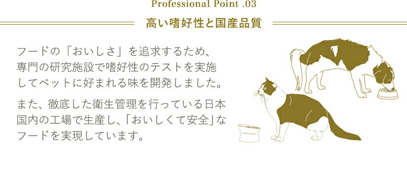 穀類(米粉、米、米ぬか)、魚介類(フィッシュミール、サーモンミール、フィッシュエキス、フィッシュコラーゲン)、油脂類(動物性油脂、ライスファットカルシウム、フィッシュオイル:DHA・EPA源、米胚芽油)、糖類(フラクトオリゴ糖)、共棲発酵エキス(乳酸菌、納豆菌、酵母菌)、シャンピニオンエキス、セレン酵母、ビタミン類(A、E、K3、B1、B2、パントテン酸、ナイアシン、B6、葉酸、ビオチン、B12、C、コリン)、ミネラル類(カルシウム、リン、ナトリウム、カリウム、塩素、鉄、コバルト、銅、マンガン、亜鉛アミノ酸複合体、亜鉛、ヨウ素)、アミノ酸類(メチオニン、トリプトファン、タウリン)、酸化防止剤(ガンマーオリザノール、ローズマリー抽出物、ミックストコフェロール)