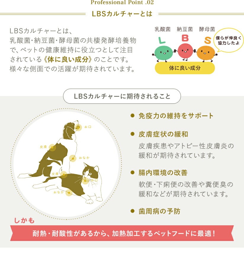 腎臓・心臓の健康維持のためリン・ナトリウム・たんぱく質の含有量を調整。腸内フローラを整える「LBSカルチャー」配合で免疫維持をサポート。輝く毛並と皮膚の健康維持に米胚芽油・亜鉛アミノ酸複合体を配合。大切な家族のエイジングケアに、脳、関節お腹、口腔の健康維持にも配慮。