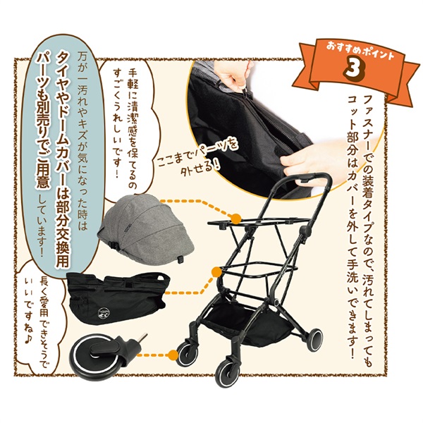 ドームカバーやかご側面はファスナーで取り外しができるので、お手入れがより手軽に!