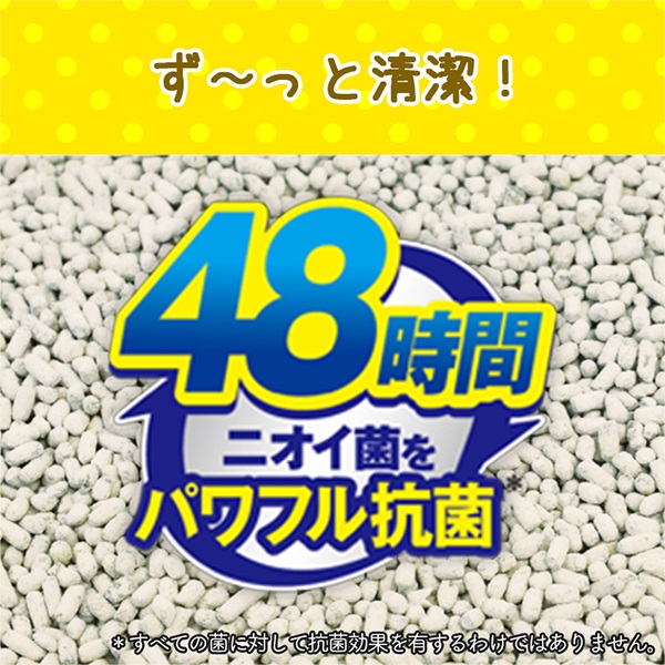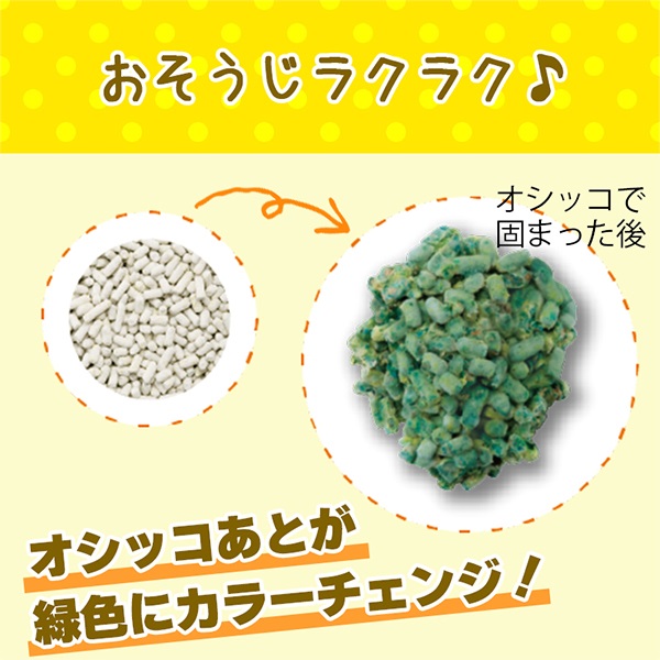 オシッコあとが緑色に変わる・鉱物製の猫砂。・オシッコのあとが緑色に変わるから取り除きラクラク。・48時間ニオイ菌をパワフル抗菌。・オシッコやウンチのイヤなニオイをさわやかな香りに変える独自のハーモナイズド技術を採用。