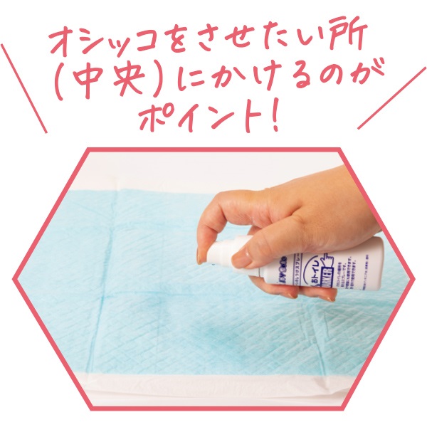 いつでもどこでもトイレのしつけをサポートする優れもの!コンパクトサイズなので持ち運びやすい!シーツやトイレ砂にニオイをつけて、ワンちゃん・ネコちゃんのトイレのしつけをサポート。スプレータイプで吹きかけるだけなので簡単です。しつけ剤特有のツンとくるにおいをできるだけ抑えた優しい香りです。