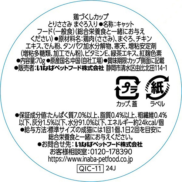 - 鶏肉(ささみ)、まぐろ、チキンエキス、でん粉、タンパク加水分解物、寒天、増粘安定剤(増粘多糖類、加工でん粉)、ビタミンE、緑茶エキス、紅麹色素