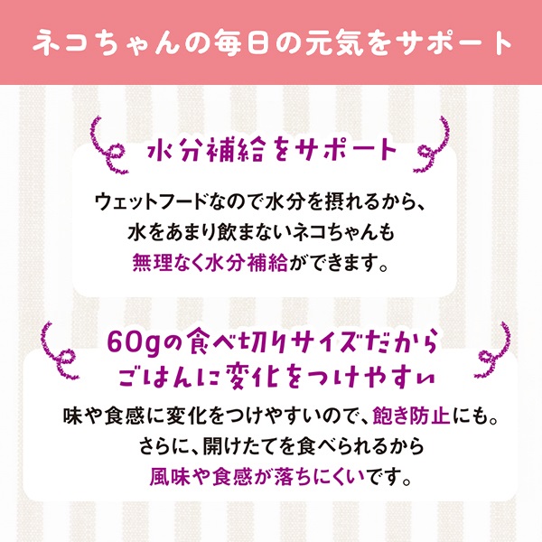 魚介類(かつお、さば、白身魚、まぐろ等)、肉類(チキン、ビーフ等)、植物性油脂、穀類、調味料(アミノ酸等)、ビタミン類(B1、B2、B6、B12、C、E、K、コリン、ナイアシン、パントテン酸、ビオチン、葉酸)、ミネラル類(Ca、Cl、Cu、Fe、I、K、Mg、Mn、Na、Zn)、アミノ酸類(タウリン)、増粘多糖類、ポリリン酸Na、EDTA-Na、発色剤(亜硝酸Na)