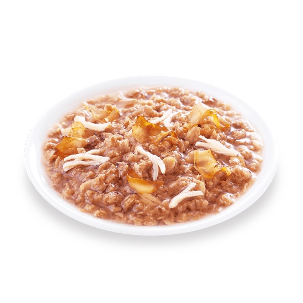 - 肉類(チキン、ささみ、ビーフ等)、魚介類(かつお、さば、まぐろ、かつお節等)、植物性油脂、穀類、調味料(アミノ酸等)、ビタミン類(B1、B2、B6、B12、C、E、K、コリン、ナイアシン、パントテン酸、ビオチン、葉酸)、ミネラル類(Ca、Cl、Cu、Fe、I、K、Mg、Mn、Na、Zn)、アミノ酸類(タウリン)、増粘多糖類、ポリリン酸Na、EDTA-Na、発色剤(亜硝酸Na)