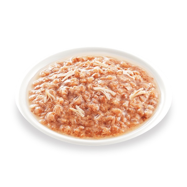 肉類(チキン、ビーフ、ささみ等)、魚介類(かつお、さば、まぐろエキス等)、植物性油脂、穀類、調味料(アミノ酸等)、ビタミン類(B1、B2、B6、B12、C、E、K、コリン、ナイアシン、パントテン酸、ビオチン、葉酸)、ミネラル類(Ca、Cl、Cu、Fe、I、K、Mg、Mn、Na、Zn)、アミノ酸類(タウリン)、増粘多糖類、ポリリン酸Na、EDTA-Na、発色剤(亜硝酸Na)