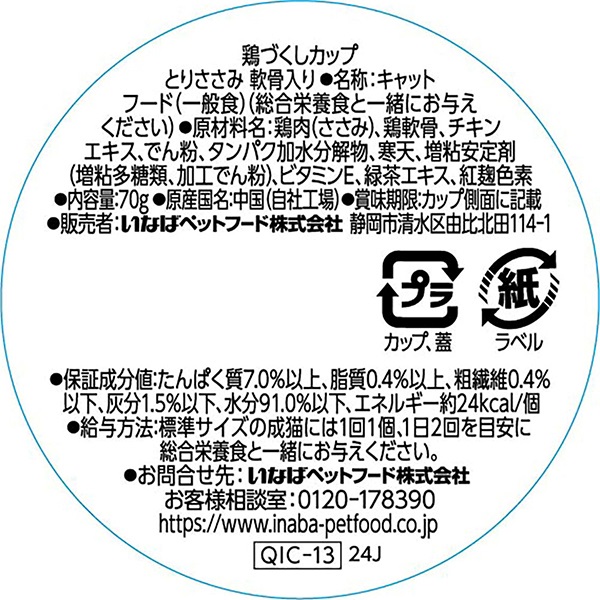 - たんぱく質:7.0%以上、脂質:0.4%以上、粗繊維:0.4%以下、灰分:1.5%以下、水分:91.0%以下