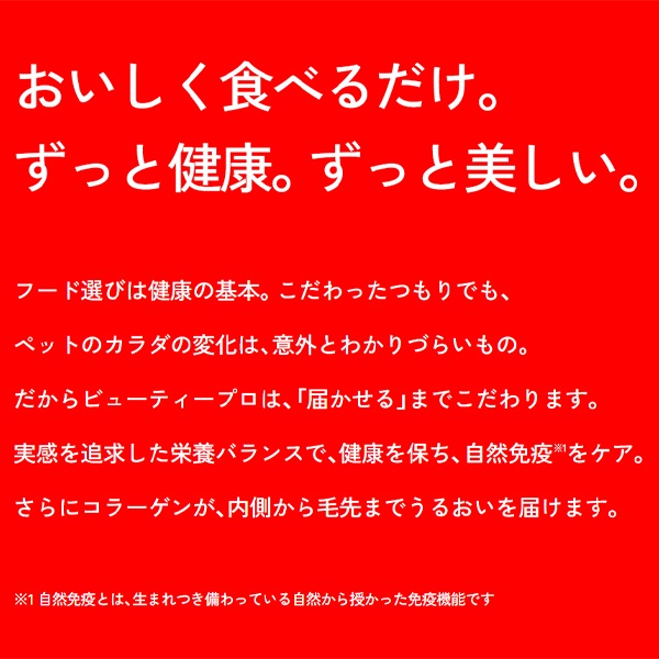 「健康なカラダは美しい」獣医師監修のビューティープロ。おいしく食べて健康を保ちながら、体調の良さと毛並みの美しさを実感。