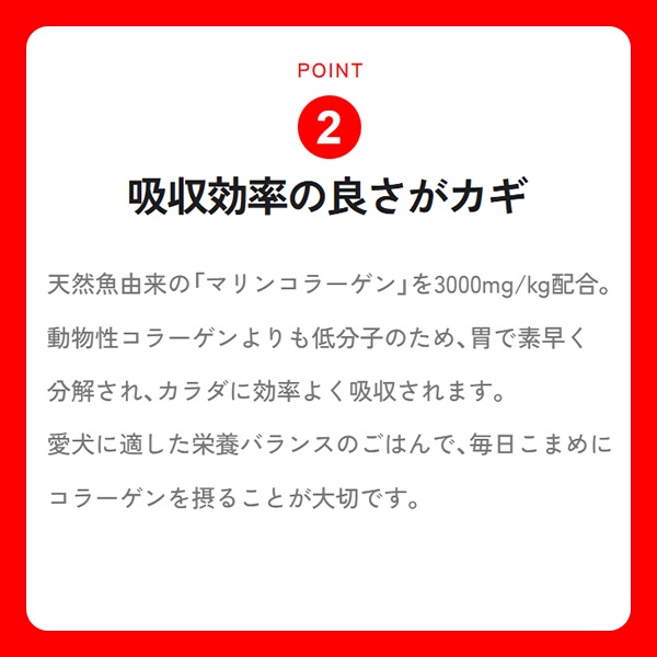●関節・皮膚・被毛の維持にコラーゲン3000mg/kg配合。