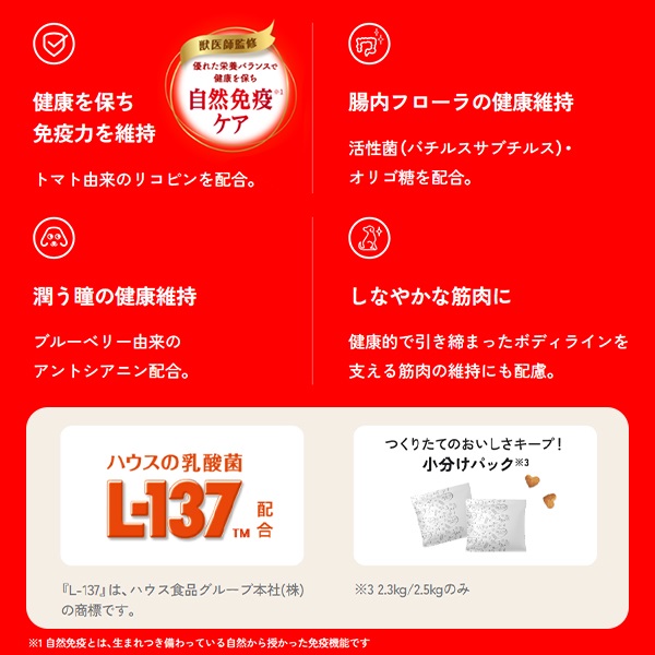 ●優れた栄養バランスにより健康を保ち「自然免疫ケア」。(自然免疫とは、犬に生まれつき備わっている自然から授かった免疫機能です。)
