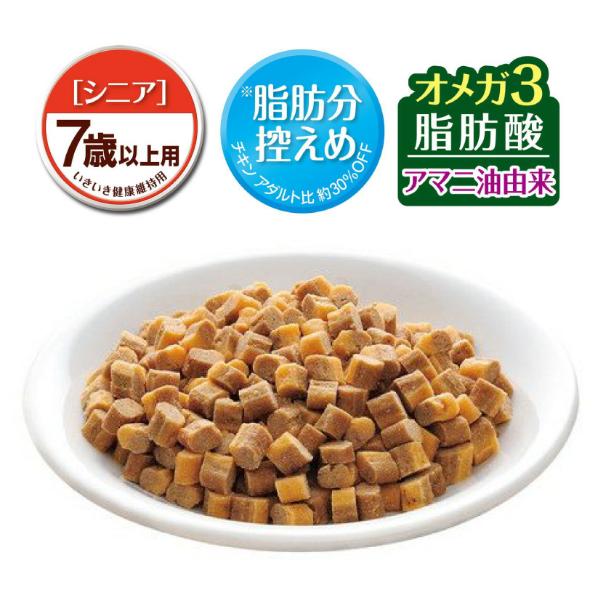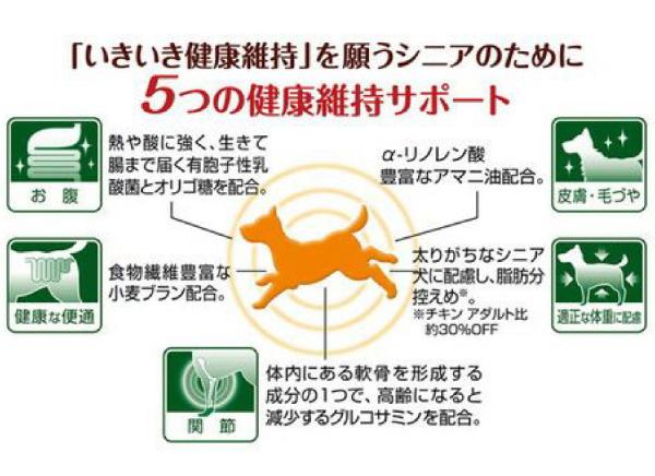 「いきいき健康維持」を願うシニアのために5つ(お腹、皮膚・毛づや、健康な便通、関節、適正な体重に配慮)の健康維持サポート。