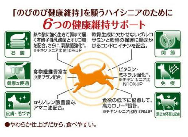 「のびのび健康維持」を願うハイシニアのために6つ(お腹、皮膚・毛づや、健康な便通、関節、適正な体重に配慮、免疫)の健康維持サポート。