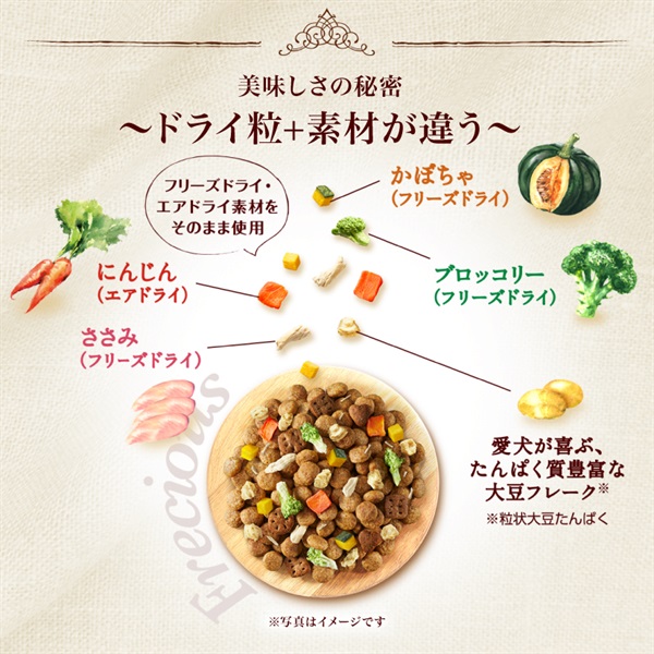 ・素材の旨みをぎゅっとフレッシュパックした国産プレミアムドッグフードです。