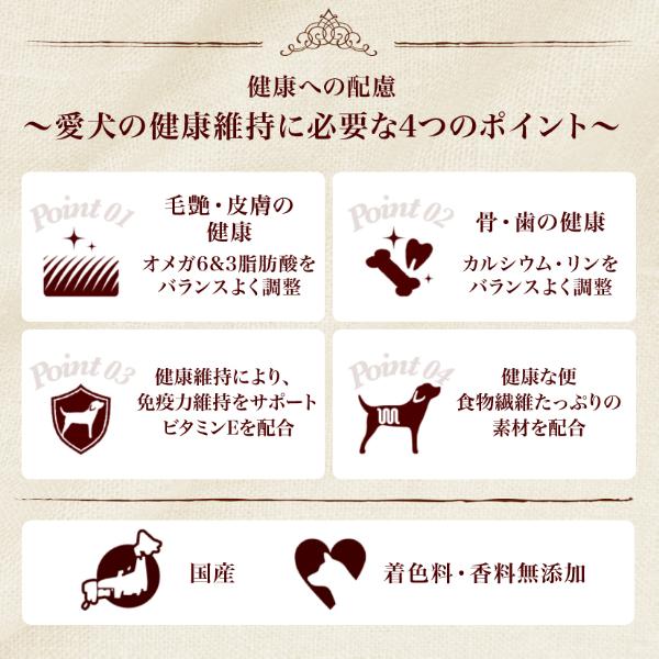 ・素材の旨みをぎゅっとフレッシュパックした国産プレミアムドッグフードです。