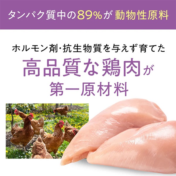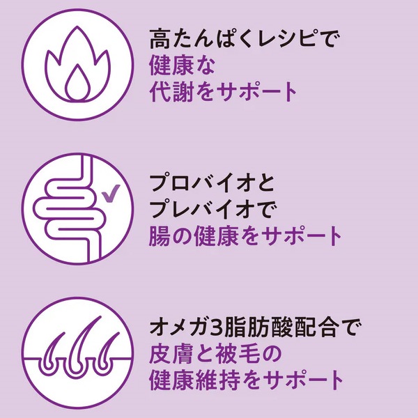良質な動物性たんぱく質が健康な代謝をサポートし、オメガ-3脂肪酸が皮膚と被毛の健康を維持します。