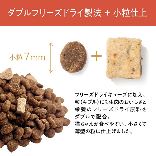 骨抜き鶏肉、チキンミール、エンドウ豆、レンズ豆、オートミール、鶏脂肪、ナチュラルチキンフレーバー、アルファルファミール、大麦、フリーズドライ(チキン、サツマイモ、カボチャ、タラ肝、緑イ貝、昆布)、エンドウ豆繊維、魚油、リンゴ、ブルーベリー、ニンジン、クランベリー、カボチャ、ショウガ、酵母エキス、イヌリン、ユッカエキス、ビフィズス菌発酵産物、エンテロコッカスフェシウム菌発酵産物、ラクトバチルスアシドフィルス菌発酵産物、ラクトバチルスカゼイ菌発酵産物、ヒマワリ油、キャノーラ油、ビタミン類(コリン、E、C、ナイアシン、パントテン酸、B2、A、B1、B12、K、B6、ビオチン、D3、葉酸)、ミネラル類(カリウム、ナトリウム、亜鉛、鉄、カルシウム、マンガン、銅、セレン、ヨウ素)、アミノ酸類(タウリン、DL-メチオニン、L-リジン、L-カルニチン)、酸化防止剤(ビタミンE、クエン酸、ローズマリー抽出物)