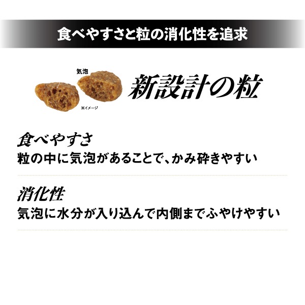 腎臓・心臓の健康維持のためリン・ナトリウム・たんぱく質の含有量を調整。腸内フローラを整える「LBSカルチャー」配合で免疫維持をサポート。輝く毛並と皮膚の健康維持に米胚芽油・亜鉛アミノ酸複合体を配合。大切な家族のエイジングケアに、脳、関節お腹、口腔の健康維持にも配慮。超小粒タイプ。 <総合栄養食>