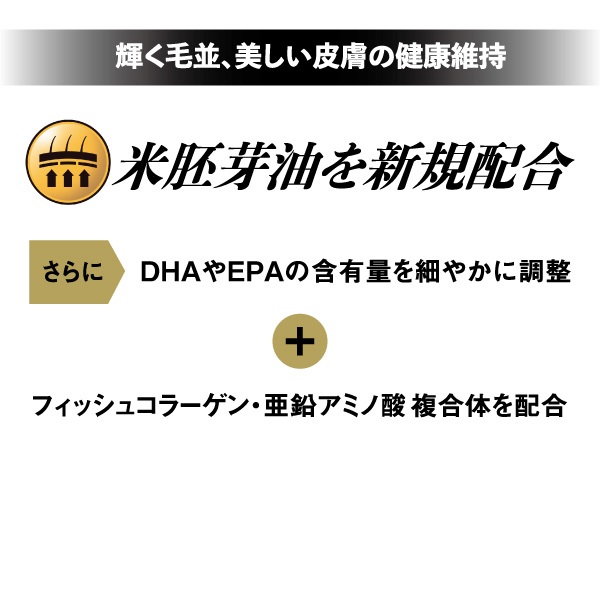 腎臓・心臓の健康維持のためリン・ナトリウム・たんぱく質の含有量を調整。腸内フローラを整える「LBSカルチャー」配合で免疫維持をサポート。輝く毛並と皮膚の健康維持に米胚芽油・亜鉛アミノ酸複合体を配合。大切な家族のエイジングケアに、脳、関節お腹、口腔の健康維持にも配慮。