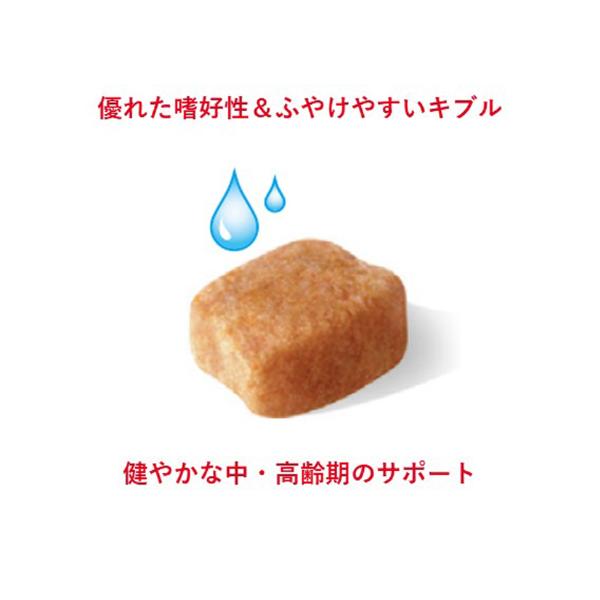 中・高齢期のダックスフンドがしっかりと噛めるように最適な大きさ、形、食感にキブル(粒)を特別に設計しています。また、ふやけやすくすることで中・高齢期のダックスフンドの食欲を刺激します。