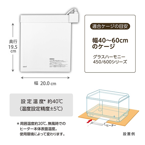 ●コンセントに差してケージの下に敷くだけのカンタン設置。ケージの外に設置するのでペットにかじられる心配がなく、汚れにくいので清潔にご使用いただけます。熱をペットに直接当てずにやさしく保温するので、低温やけどなどの心配も不要です。