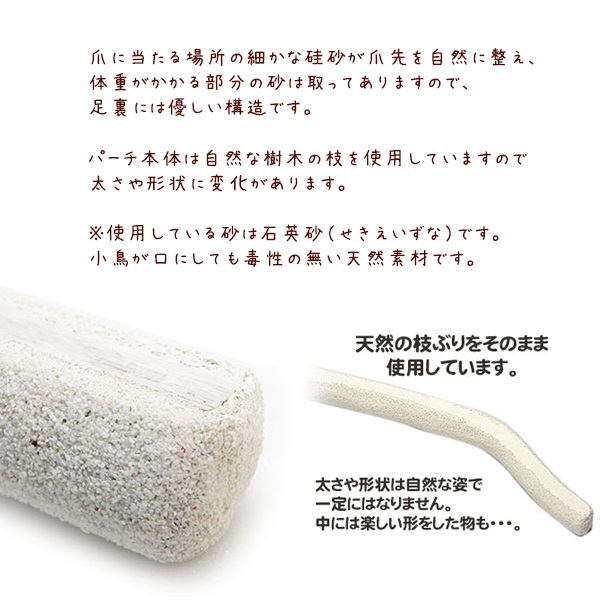 小鳥用サンドパーチ。細かい砂が足に優しく爪先を摩耗!クチバシとぎにも!体重がかかる部分の砂をカット!足裏の皮膚へのダメージを軽減!