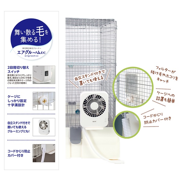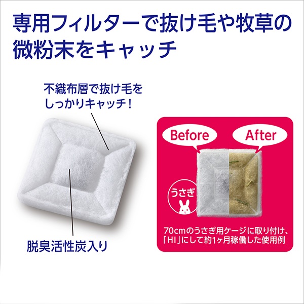 専用フィルターを使用して微細な毛や粉塵をキャッチし、ケージ内の空気の循環にも役立ちます。