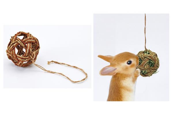 天然のわらとラタンの編み上げだから安心・安全です。ボールの中に牧草を詰めて与えることもできます。