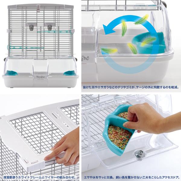 抜けた羽やエサガラなどのチリやゴミがケージの外に飛散するのを軽減するデブリガードなど便利な機能、清潔機能がいっぱいです。