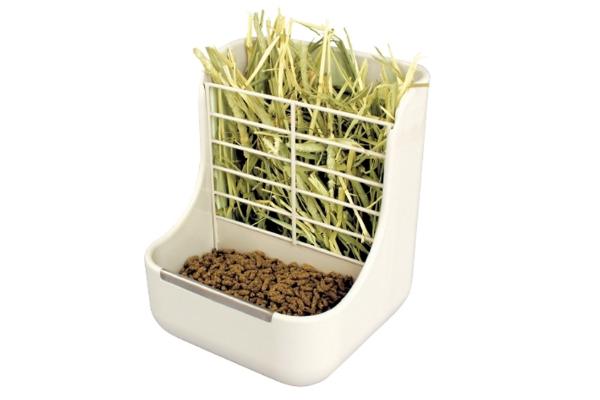牧草BOXの手前にフードBOXをつけることでこぼれを防止できる新型フード&牧草BOX