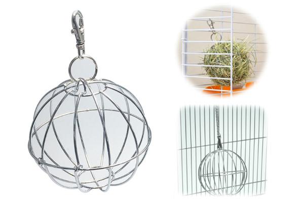 スチール性のボール型牧草ホルダー。吊り下げたり、転がしたり、楽しく牧草が食べられます。