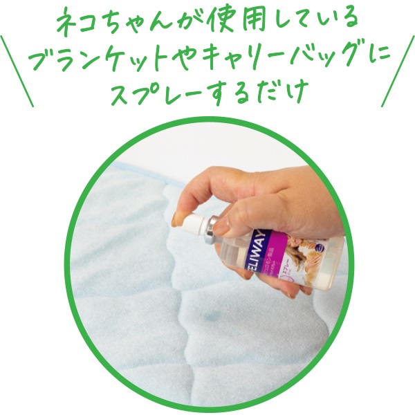 ・病院に行く前にキャリー、ケースなどに噴霧するようにします。・必要であれば、猫ちゃんを包む毛布やタオルに噴霧します。・猫ちゃんがよよく過ごす場所(ソファや寝床など)に噴霧します。