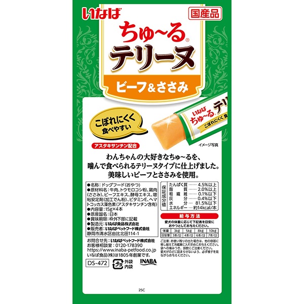 - 牛肉、トウモロコシ粉、鶏肉(ささみ)、ビーフエキス、酵母エキス、加工でん粉、ビタミンE、ヘマトコッカス藻色素(アスタキサンチン含有)