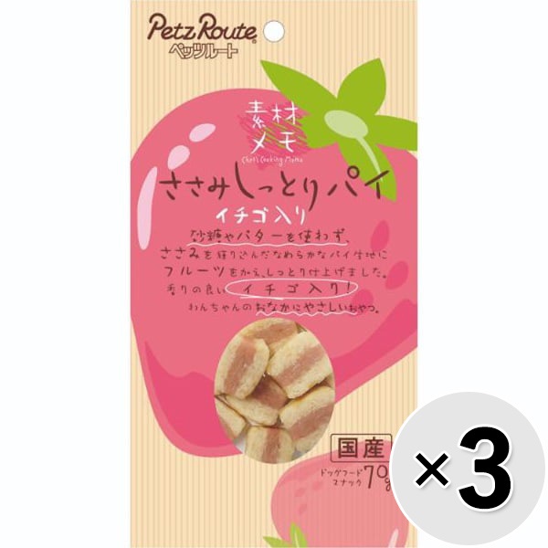 - 小麦粉、鶏ささみ、ショートニング、イチゴパウダー、ソルビトール、プロピレングリコール、膨張剤、保存料(ソルビン酸K)、pH調整剤、食塩、着色料(クチナシ、赤106、黄4)、酸化防止剤(エリソルビン酸Na)、香料