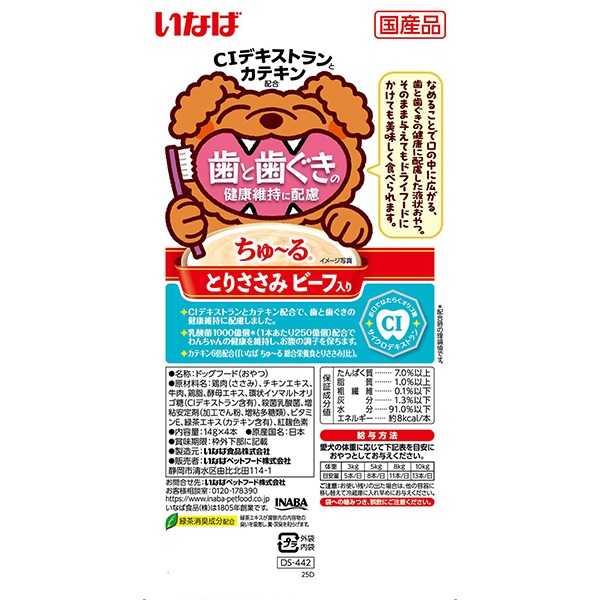 - 鶏肉(ささみ)、チキンエキス、牛肉、鶏脂、酵母エキス、環状イソマルトオリゴ糖(CIデキストラン含有)、殺菌乳酸菌、増粘安定剤(加工でん粉、増粘多糖類)、ビタミンE、緑茶エキス(カテキン含有)、紅麹色素