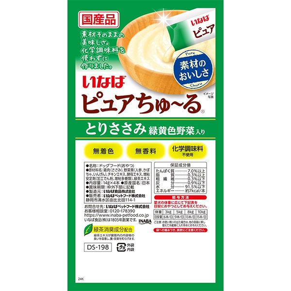 - 鶏肉(ささみ)、野菜類(人参、かぼちゃ、いんげん)、チキンエキス、酵母エキス、増粘安定剤(加工でん粉、増粘多糖類)、緑茶エキス
