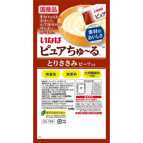 - 鶏肉(ささみ)、チキンエキス、牛肉、酵母エキス、増粘安定剤(加工でん粉、増粘多糖類)、緑茶エキス