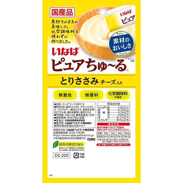 - 鶏肉(ささみ)、チキンエキス、チーズパウダー、酵母エキス、増粘安定剤(加工でん粉、増粘多糖類)、緑茶エキス