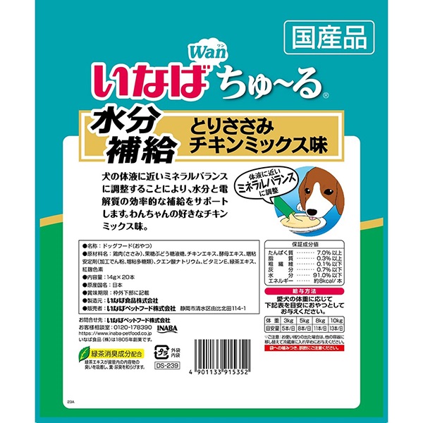 - 鶏肉(ささみ)、果糖ぶどう糖液糖、チキンエキス、酵母エキス、増粘安定剤(加工でん粉、増粘多糖類)、クエン酸ナトリウム、ビタミンE、緑茶エキス、紅麹色素